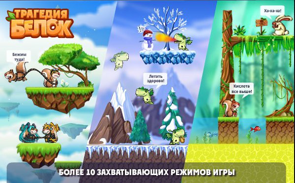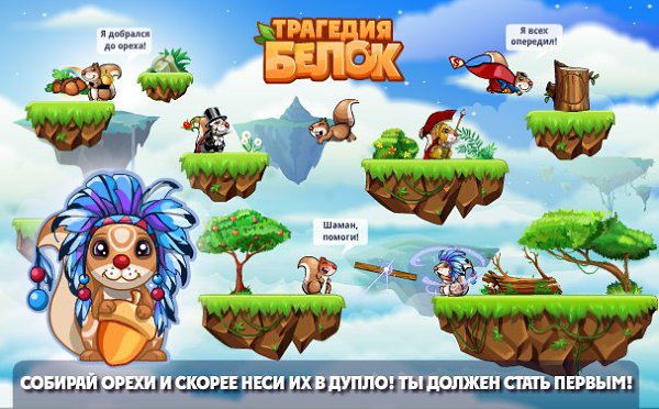 Динамичная игра с веселыми Белками, спасающимися от надвигающейся катастрофы. В роли Белки ты бегаешь по красочным уровням игры вместе с толпой других Белочек, пытаясь собрать как можно больше орехов и добраться до дупла. Всемогущий беличий шаман уже идет на помощь! Кроме того ты и сам можешь стать шаманом, для этого необходимо достигнуть 2 уровня. А с 4 уровня у тебя появится возможность создать свой клан. Прояви максимум сноровки и сообразительности, если ты намерен выжить!